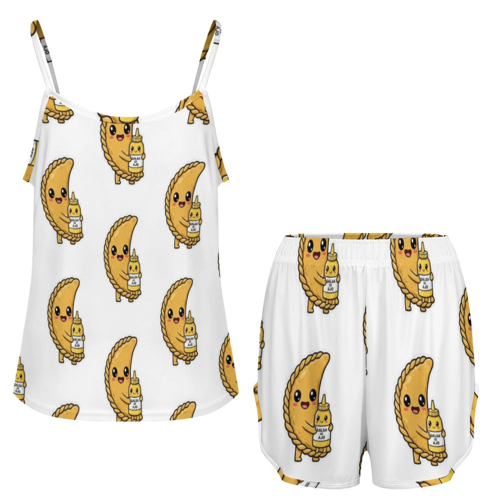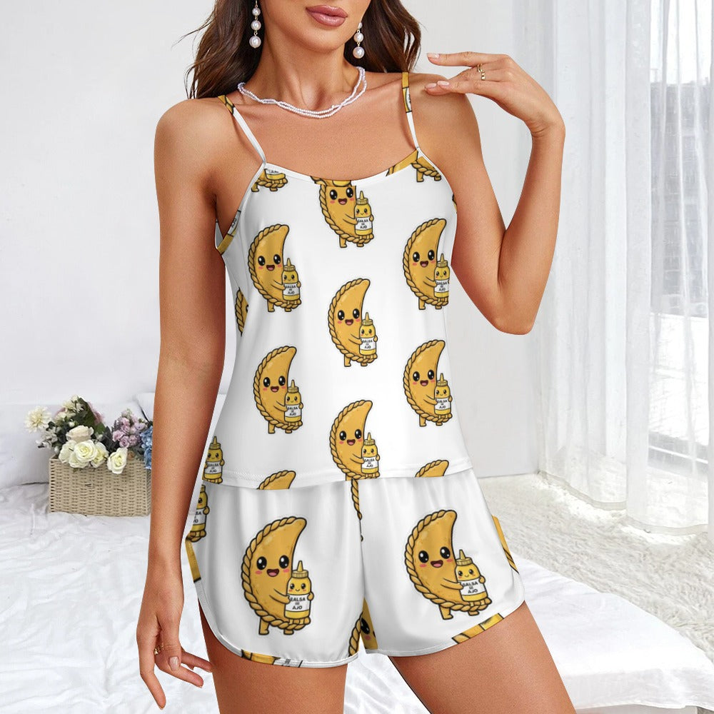 Despierta con estilo retro-caribeño. Este conjunto de pijama de seda de hielo es perfecto para esas noches tropicales donde el confort se encuentra con la nostalgia venezolana. Diseño sensual con tirantes ajustables y tejido suave que te hará sentir como en las nubes.